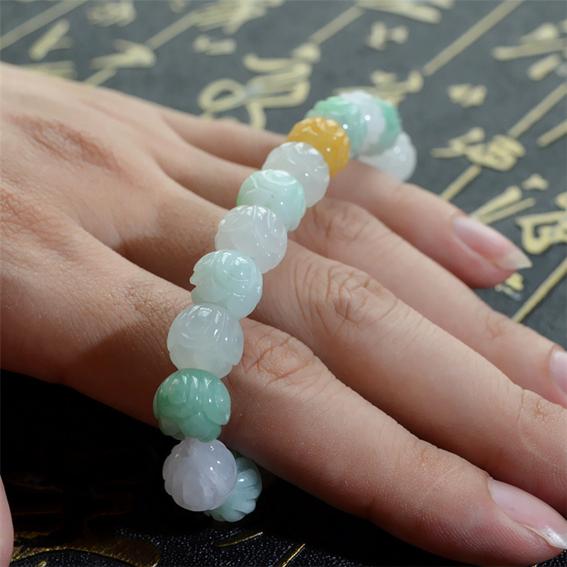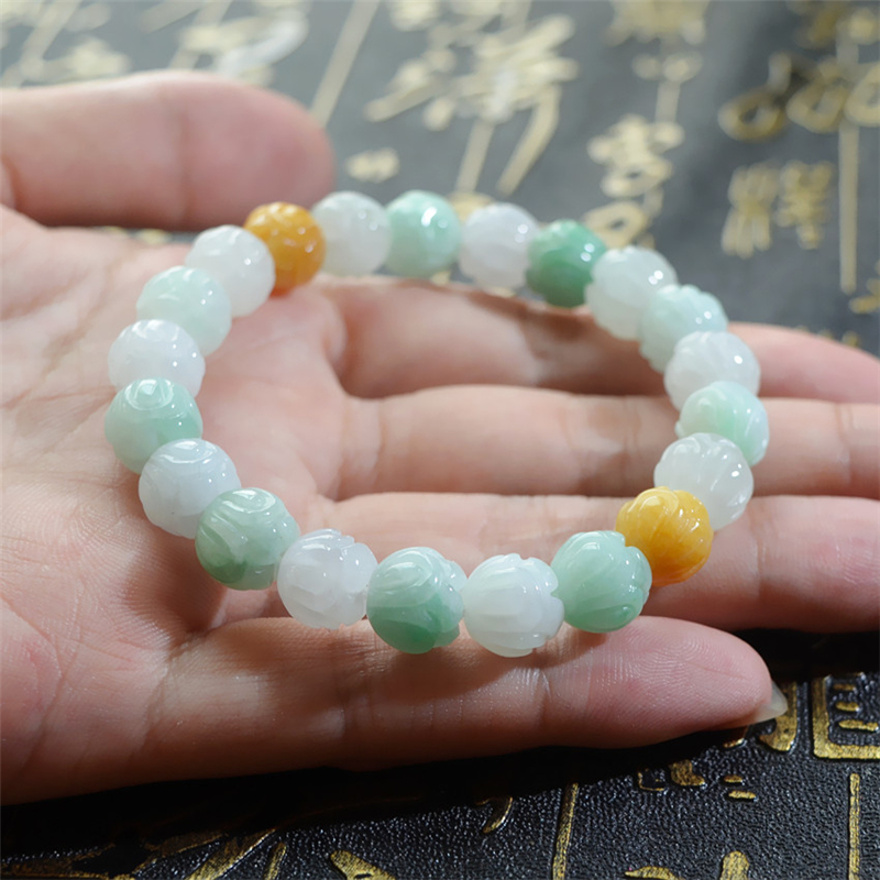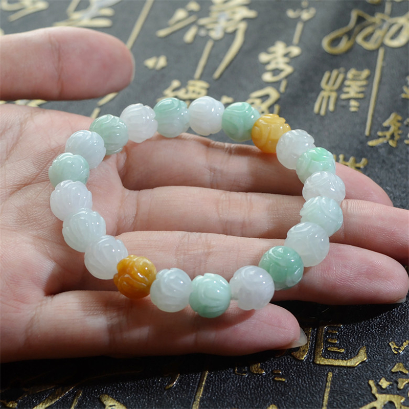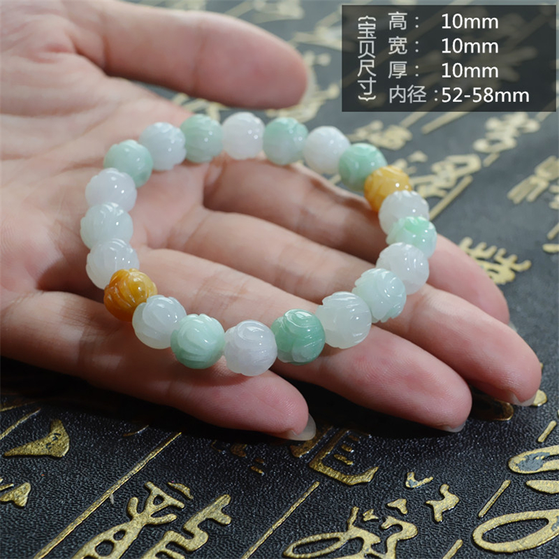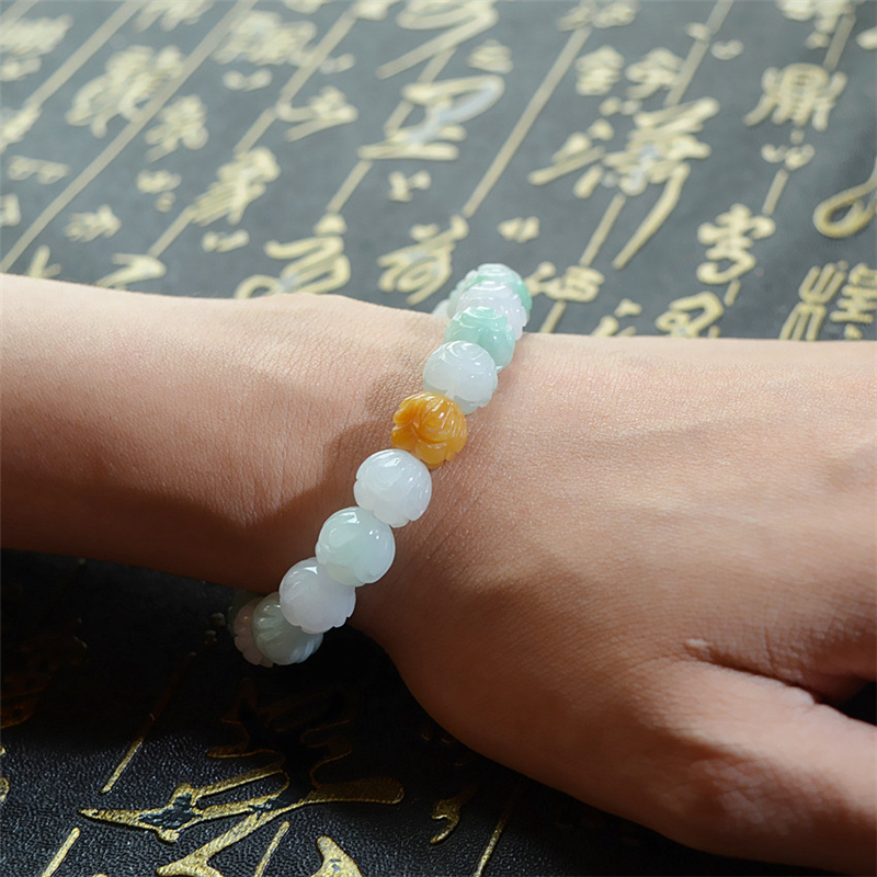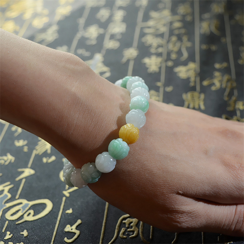 天然翡翠A货冰糯三彩莲花手链手镯女款手链玉器情人节生日礼物