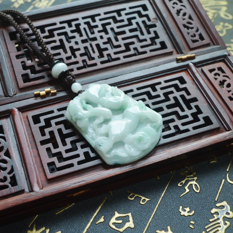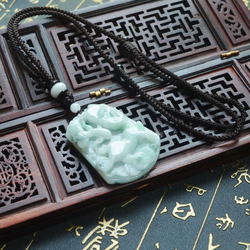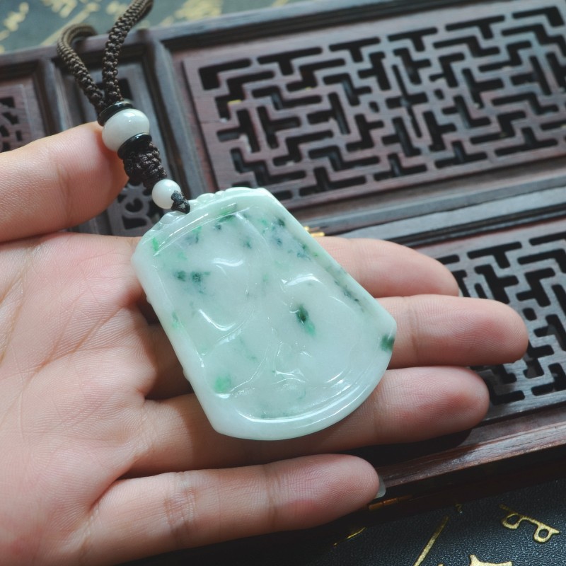 天然缅甸A货玉翡翠白底青飘花精雕如意金钱蝙蝠梅花鹿挂件吊坠