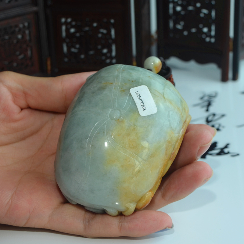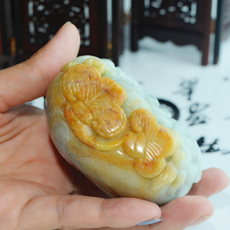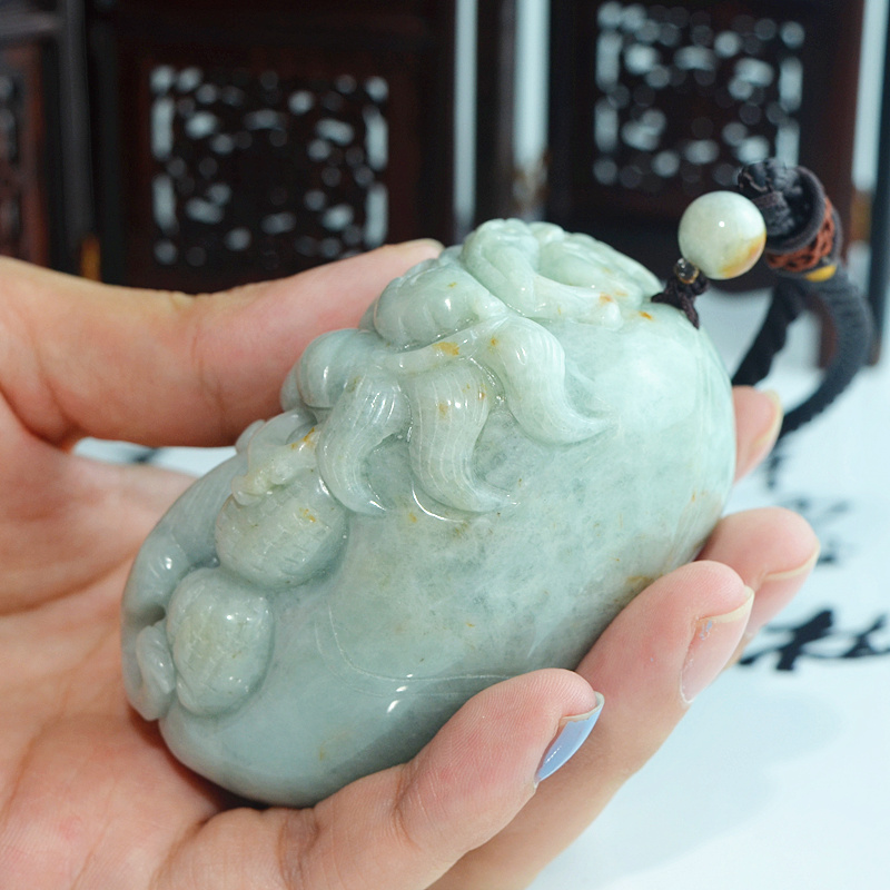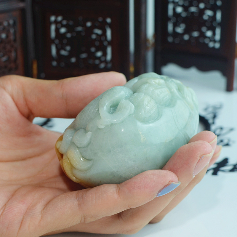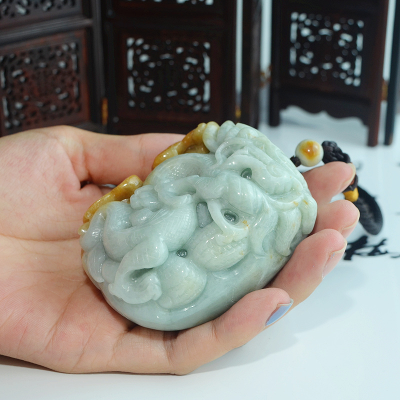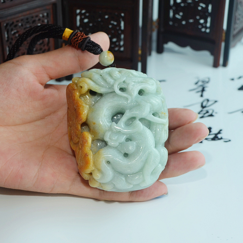 正品天然缅甸翡翠A货双色精雕祥龙如意连年生意兴隆手玩件把件