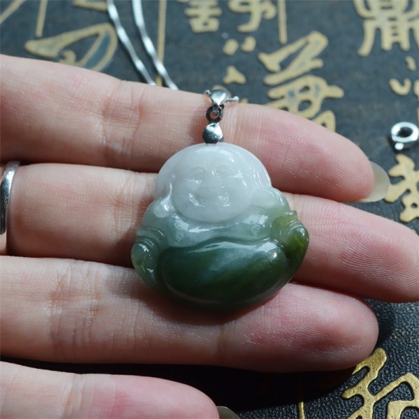 天然带绿正品佛公玉石翡翠A货玉佛女款吊坠笑佛项链玉坠配银链