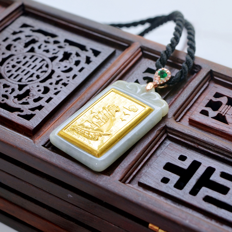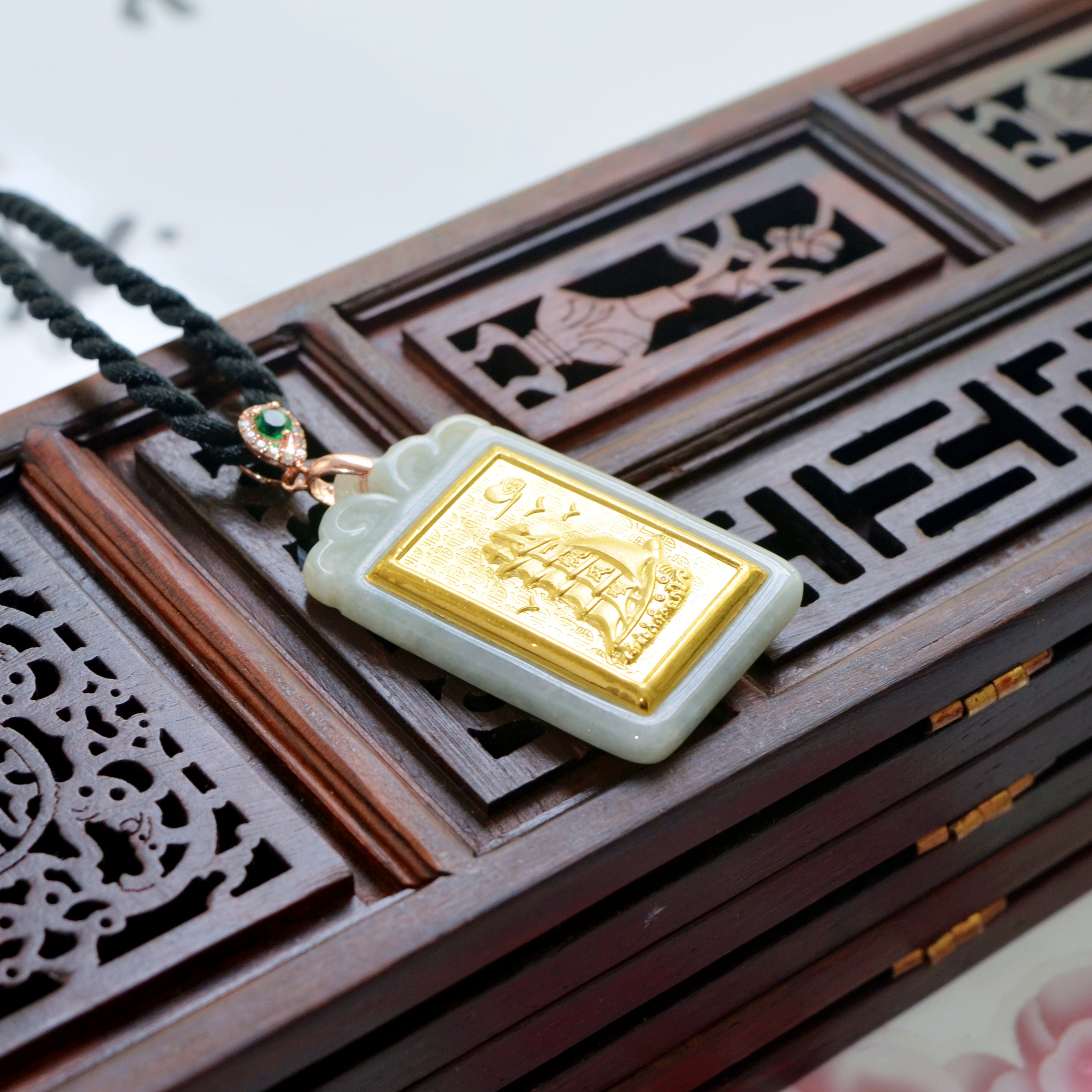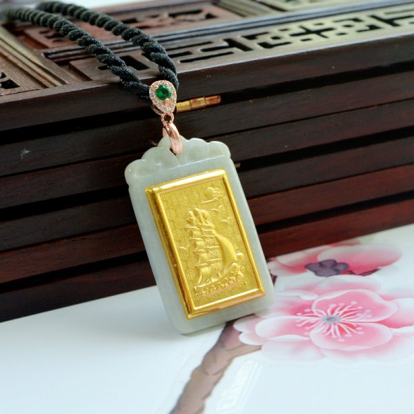 正品翡翠足金吊坠金镶玉黄金一帆风顺项链男女款玉佩足金玉牌挂件