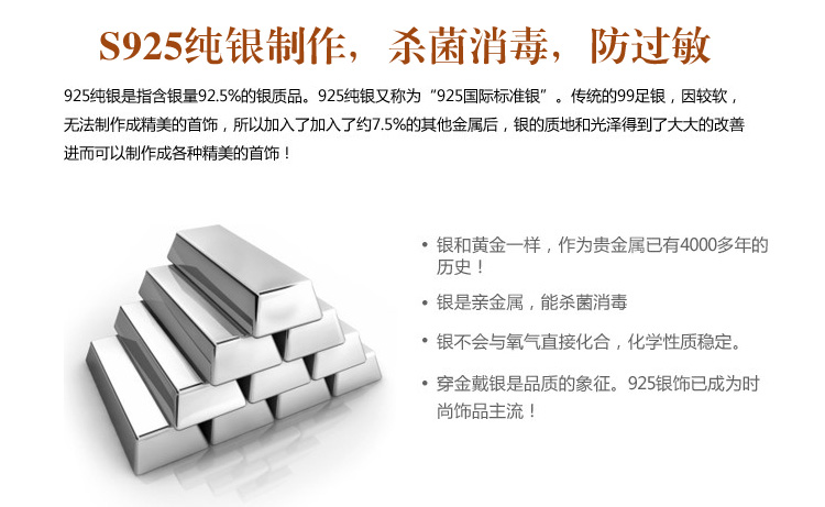 银饰品保养常识: | 保持饰品清洁干爽;勿与化学物品接触;勿与硬物碰撞;上妆前 剧烈运动 洗澡 睡觉不宜佩戴 | ||
