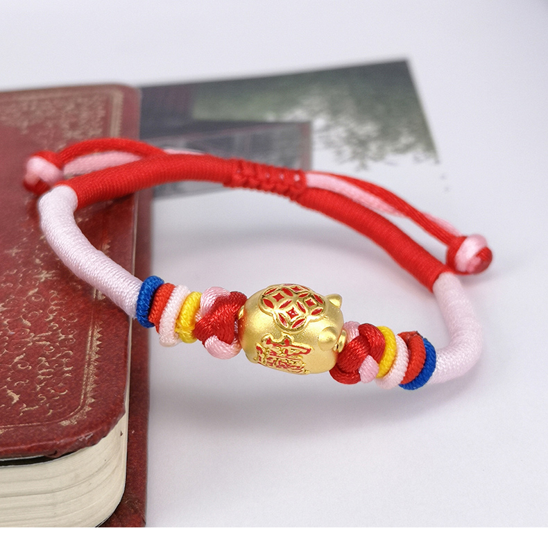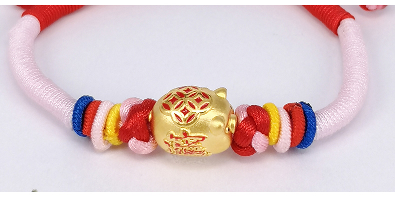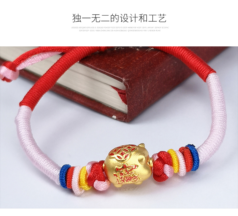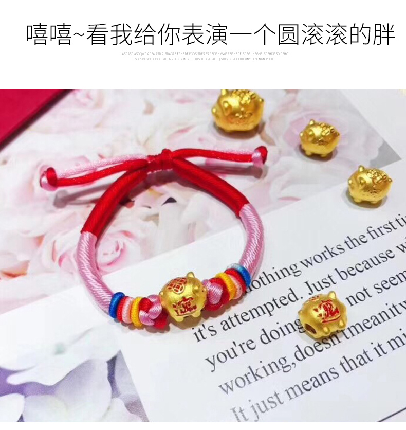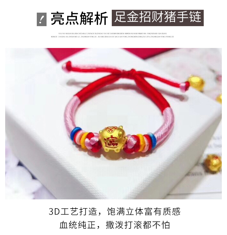 黄金手链女款999足金3D硬金萌猪生肖猪转运珠编织红绳手串可调节