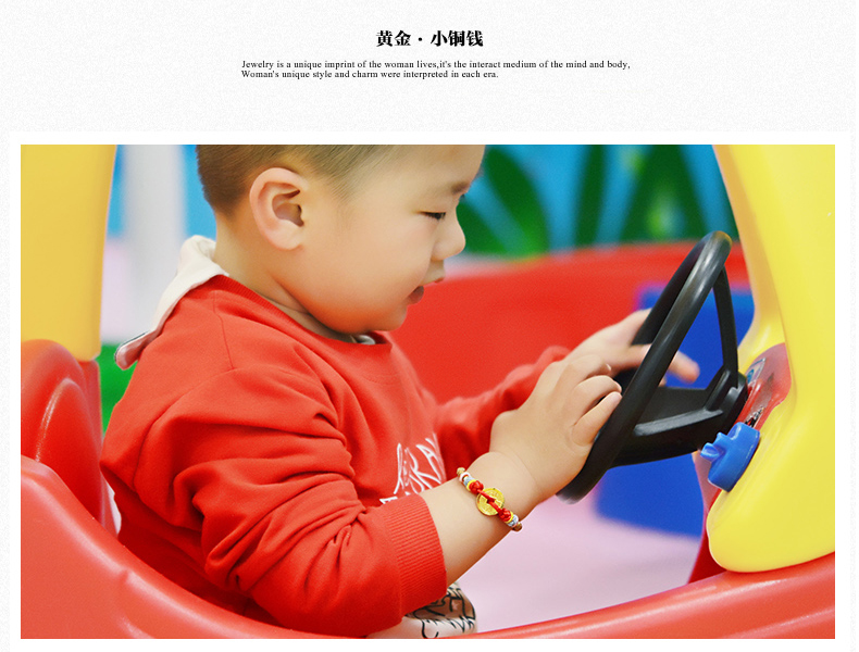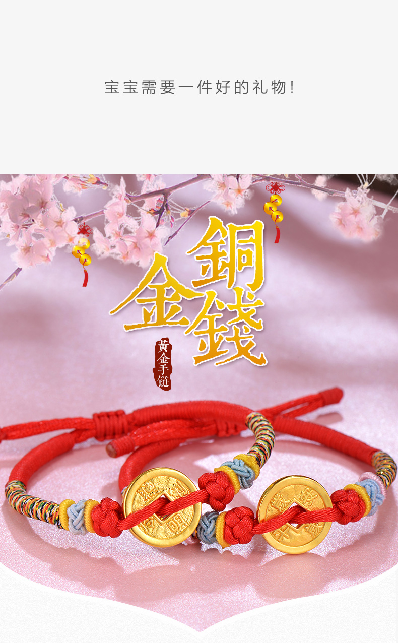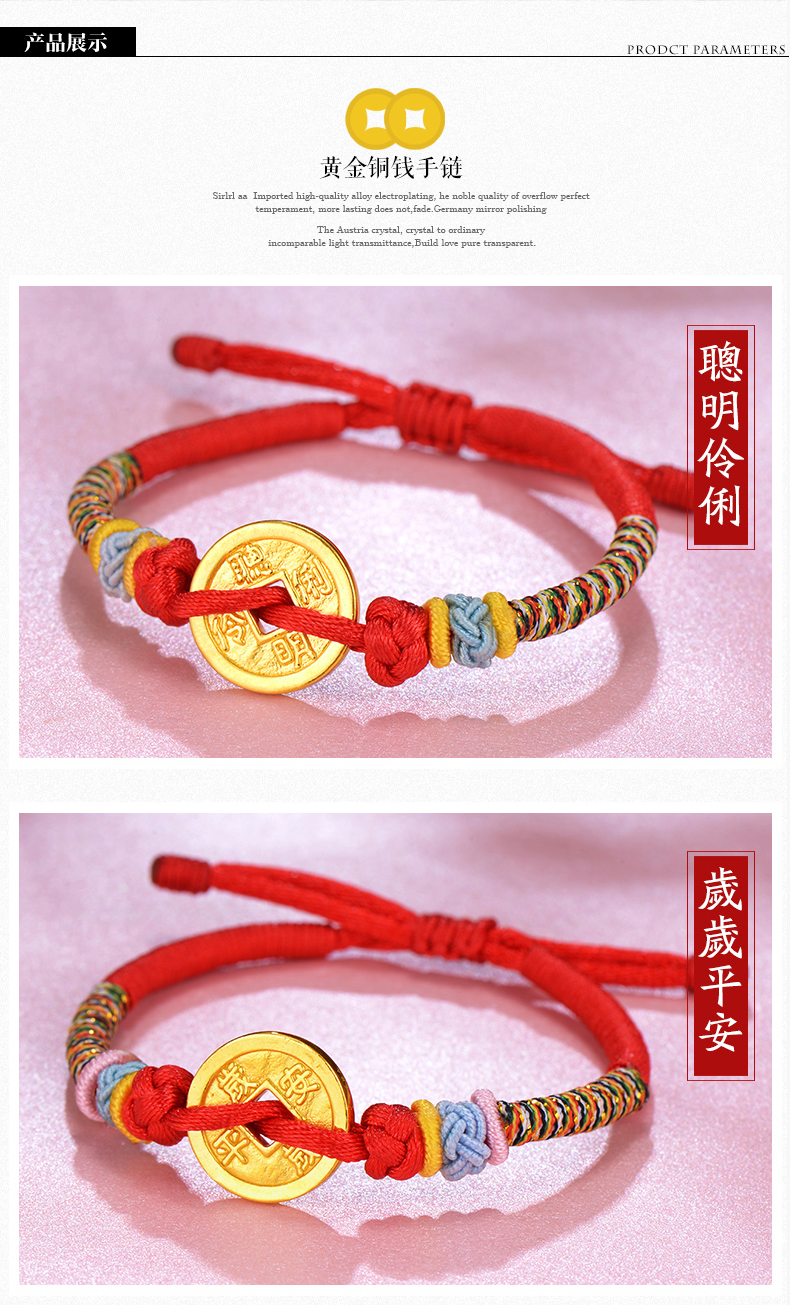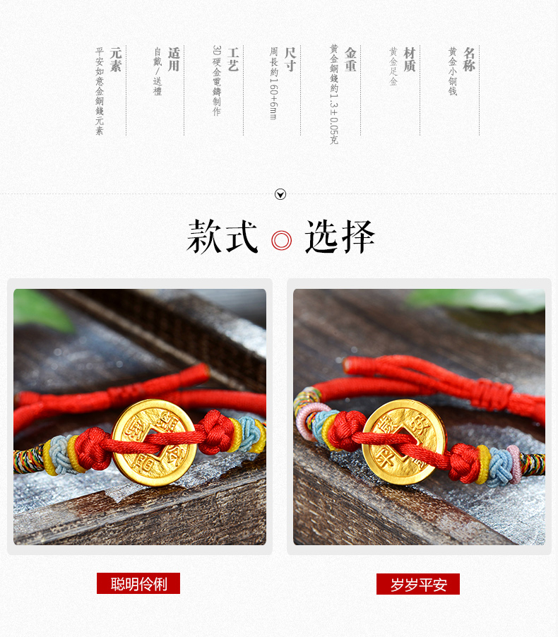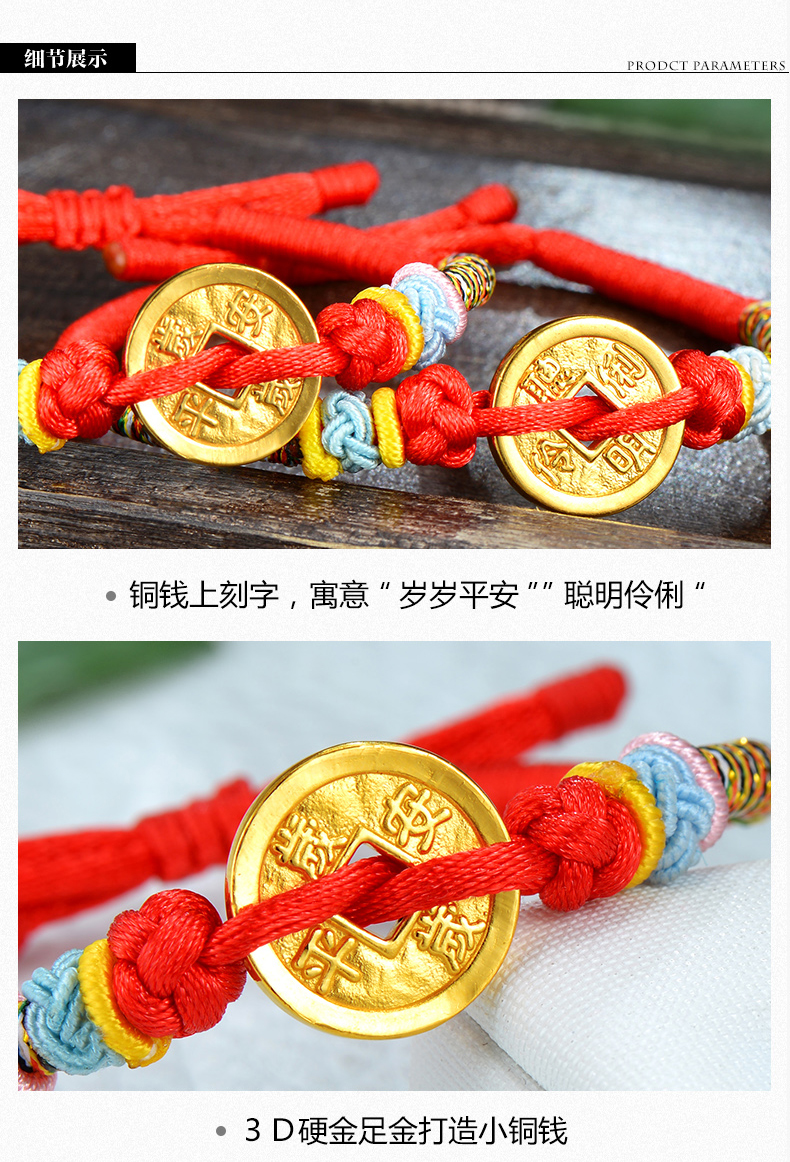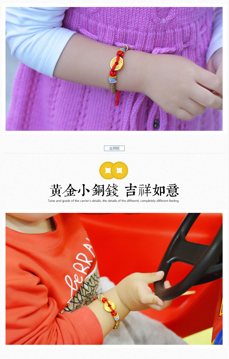 设计点:金铜钱红绳足金手链 小巧 足金 新年礼物送宝宝 | |