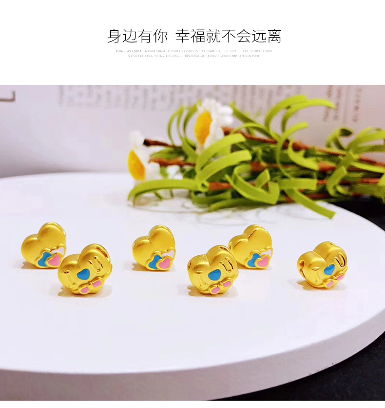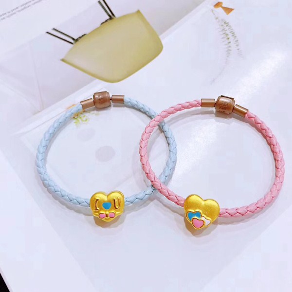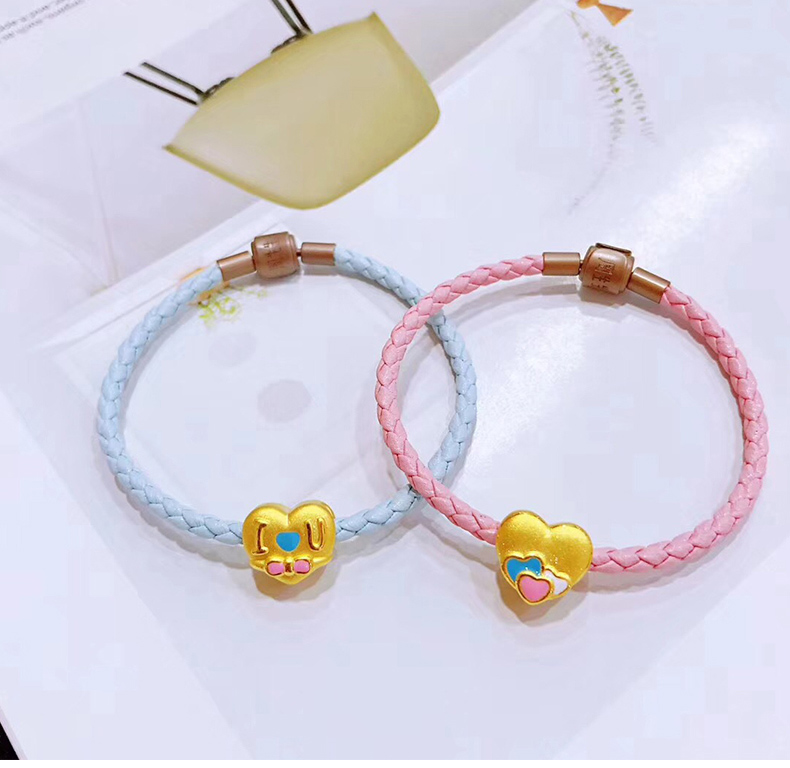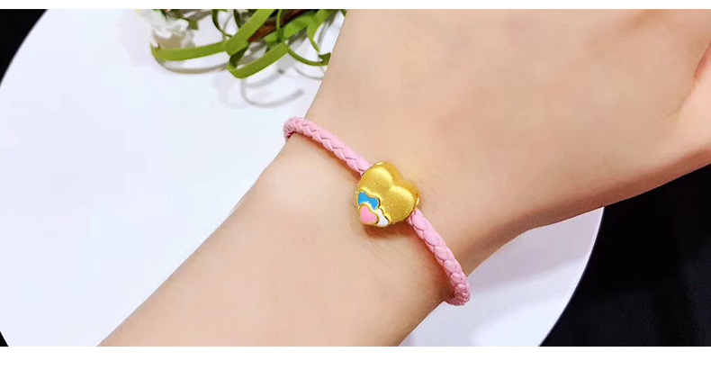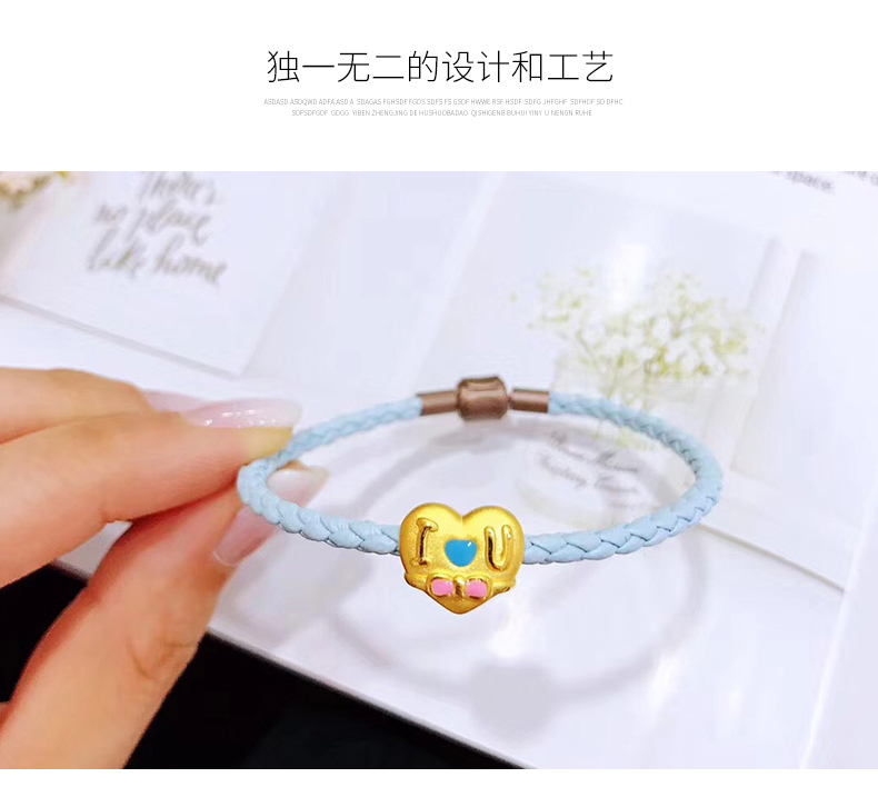 黄金手链女款999足金3d硬金新款爱心形转运珠手串编织皮绳手环