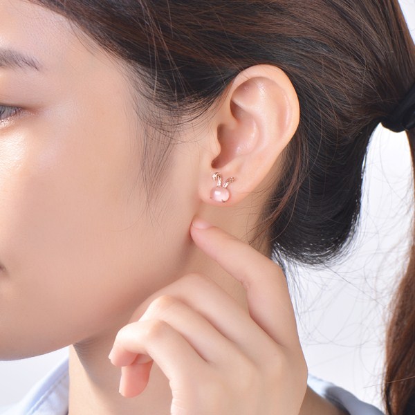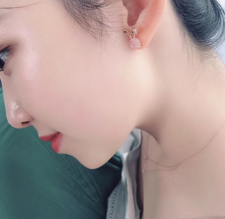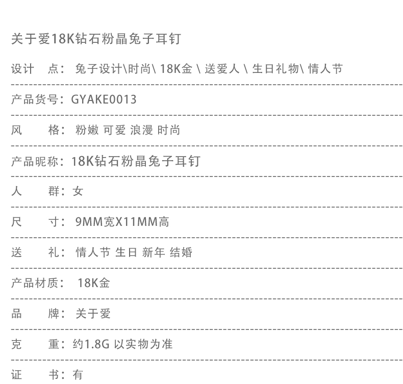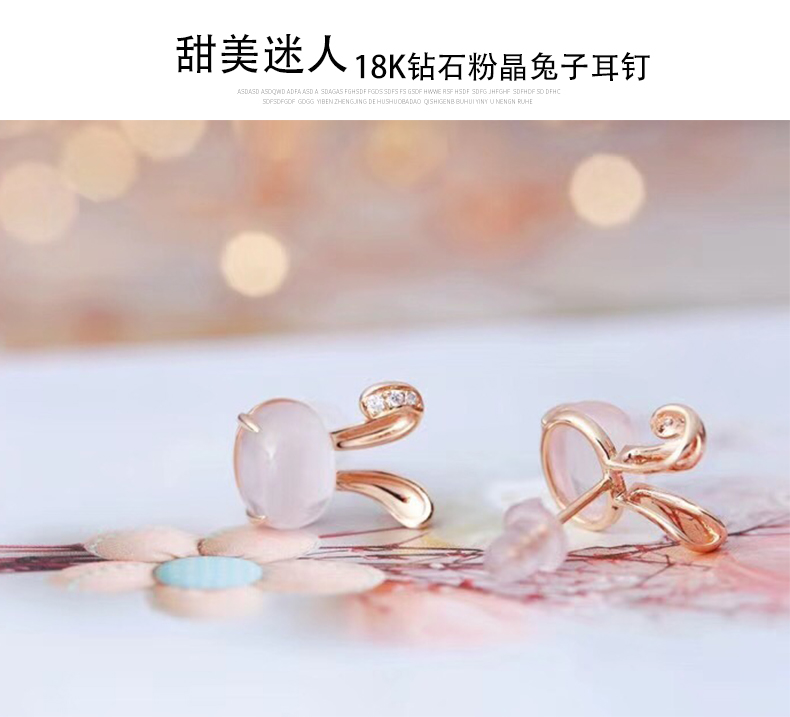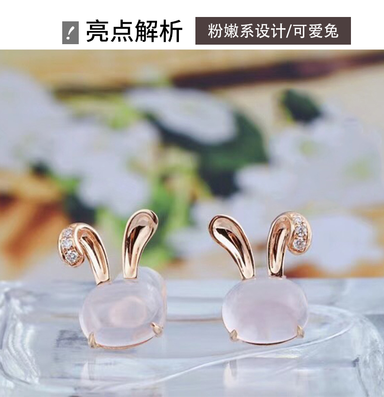彩金耳钉女18k玫瑰金女款镶嵌钻石粉晶兔子彩金耳环耳饰珠宝正品