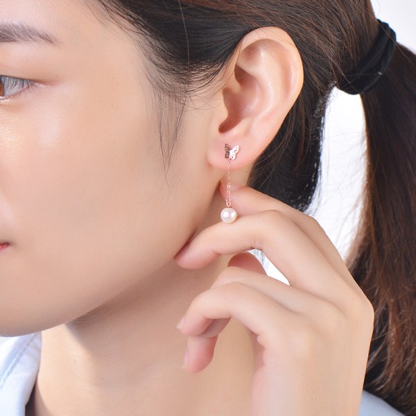 18K耳钉女迷你珍珠蝴蝶结日韩时尚简约18k金玫瑰金正品耳饰送女友