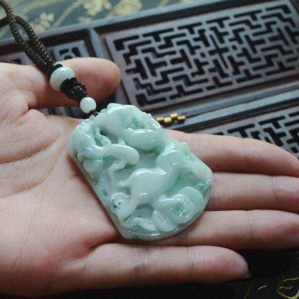 天然缅甸A货玉翡翠白底青飘花精雕如意金钱蝙蝠梅花鹿挂件吊坠