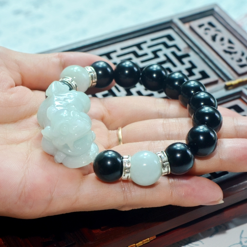 缅甸翡翠玉貔貅手链 手串玛瑙玉珠子12mm圆珠玉手链男款玉石手饰