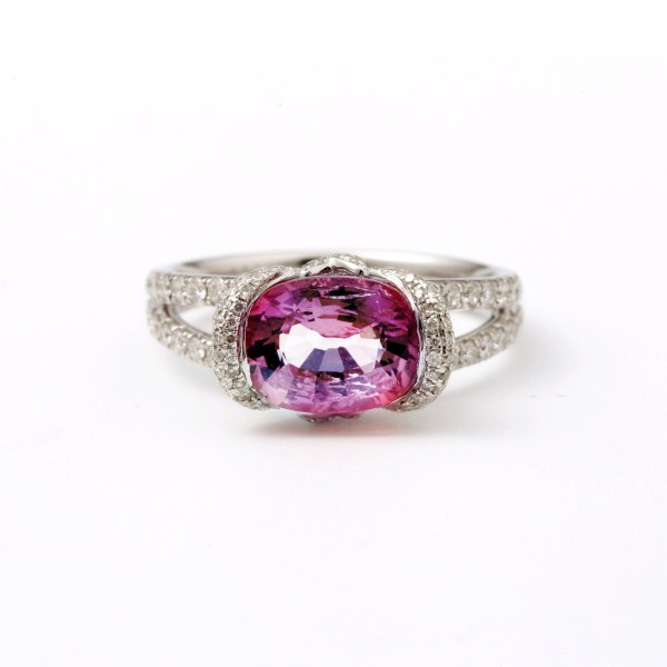 尖晶石是一族矿物,宝石级尖晶石则主要是指镁铝尖晶石,化学分子式为MgAl2O4,是一种镁铝氧化物。属等轴晶系。晶体形态为八面体及八面体与菱形十二面体的聚形。颜色丰富多彩,有无色、粉红色、红色、紫红色、浅紫色、蓝紫色、蓝色、黄色、褐色等。尖晶石的品种是依据颜色而划分的,有红、橘红、蓝紫、蓝色尖晶石等。玻璃光泽,透明。折光率1.715-1.830。均质体。硬度为8,密度3.58-4.62克/立方厘米。贝壳状断口。淡红色和红色尖晶石在长、短波紫外光下发红色荧光。