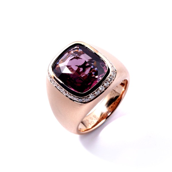 尖晶石是一族矿物,宝石级尖晶石则主要是指镁铝尖晶石,化学分子式为MgAl2O4,是一种镁铝氧化物。属等轴晶系。晶体形态为八面体及八面体与菱形十二面体的聚形。颜色丰富多彩,有无色、粉红色、红色、紫红色、浅紫色、蓝紫色、蓝色、黄色、褐色等。尖晶石的品种是依据颜色而划分的,有红、橘红、蓝紫、蓝色尖晶石等。玻璃光泽,透明。折光率1.715-1.830。均质体。硬度为8,密度3.58-4.62克/立方厘米。贝壳状断口。淡红色和红色尖晶石在长、短波紫外光下发红色荧光。
