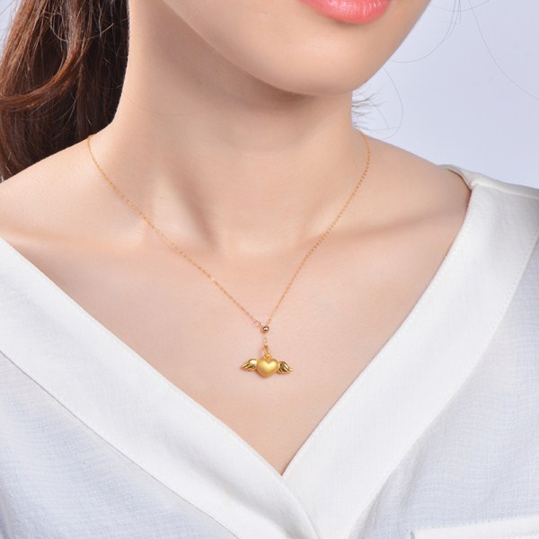 黄金项链女款999足金纯金新款3d硬金爱心天使翅膀套链18K金锁骨链