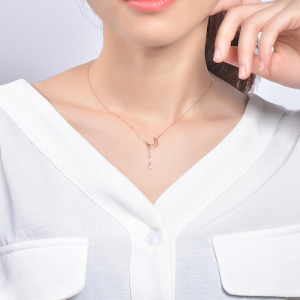 彩金项链女新款18k金梦幻星月吊坠玫瑰金K金钻石套链锁骨链饰品