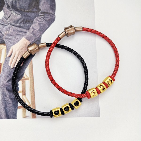 足金转运珠女999黄金手链3d硬金520编织皮绳手串路路通情侣手环