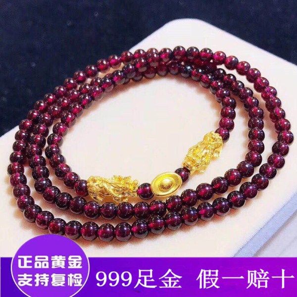 真金黄金招财元宝纯金貔貅石榴石手链3d硬金999千足金手串转运珠
